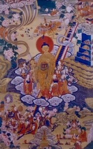 The tradition holds that after the great debate at Sravasti (celebrated during Chötrul Düchen), to avoid being treated as a god, the Buddha vanished and reappeared in the Heaven of the Thirty-Three, on the very peak of Mount Sumeru. The Budda, in gratitude, had vowed to repay his mother Mayadevi for all that she had done for him, and, as she was then residing in this heaven, he taught her and others so that they too might be free from samsara. After three months, Maudgalyayana, one of the Buddha’s main disciples, begged him to return to earth. The Buddha agreed and at the appointed time descended on a triple staircase made of lapis lazuli, gold and crystal.