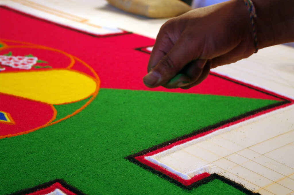 The mandala of coloured sand is a symbolic representation of the palace of the deity (in this case, the Buddha of Compassion). It serves as an aid to meditation for the monks.