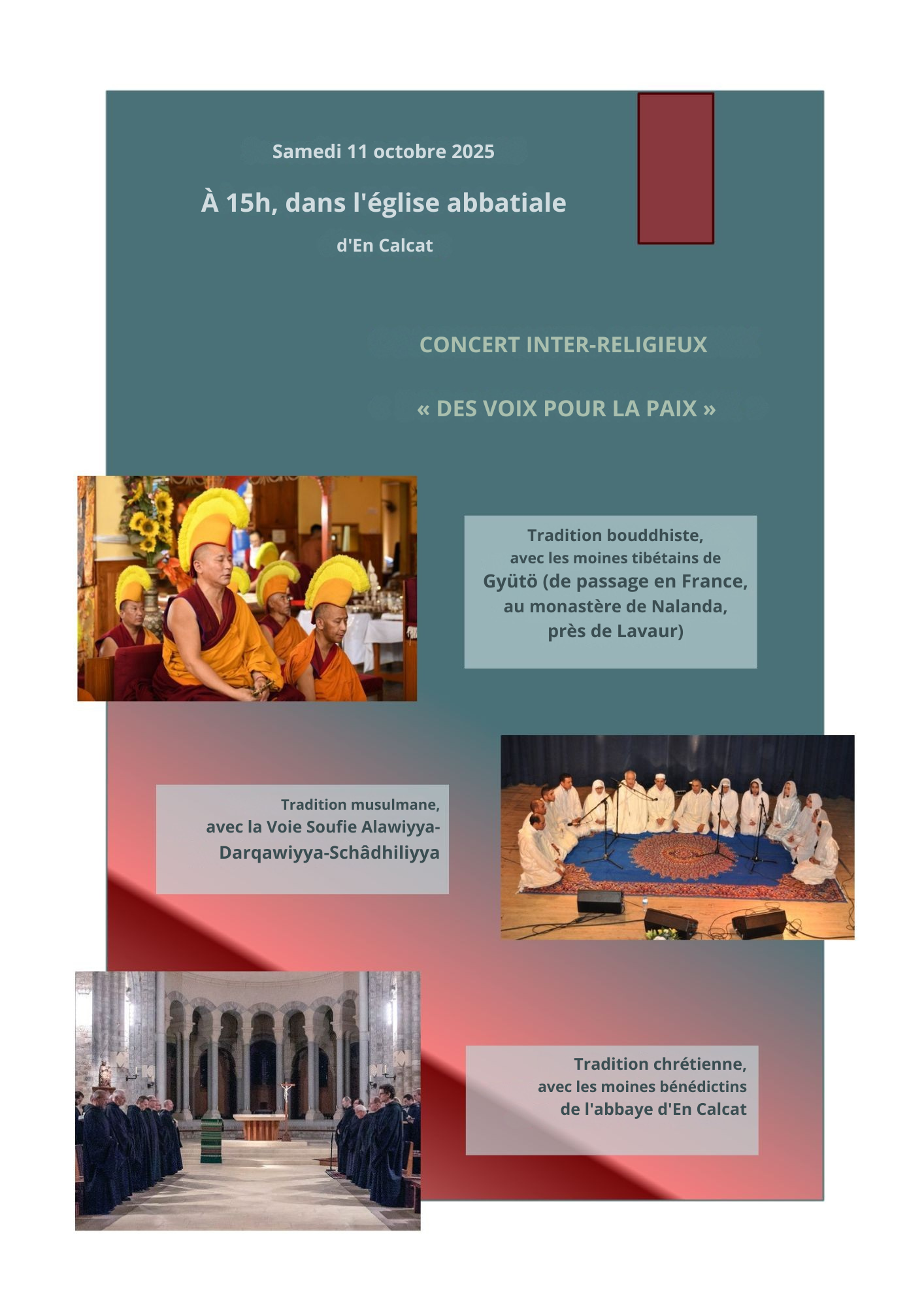 An spiritual concert for peace featuring the voices and songs of three traditions: Buddhist, Christian, and Muslim, with our Benedictine brothers from En Calcat Abbey and our sisters and brothers from the Sufi order of Alâwiyya-Darqâwiyya-Shâdhiliyya.